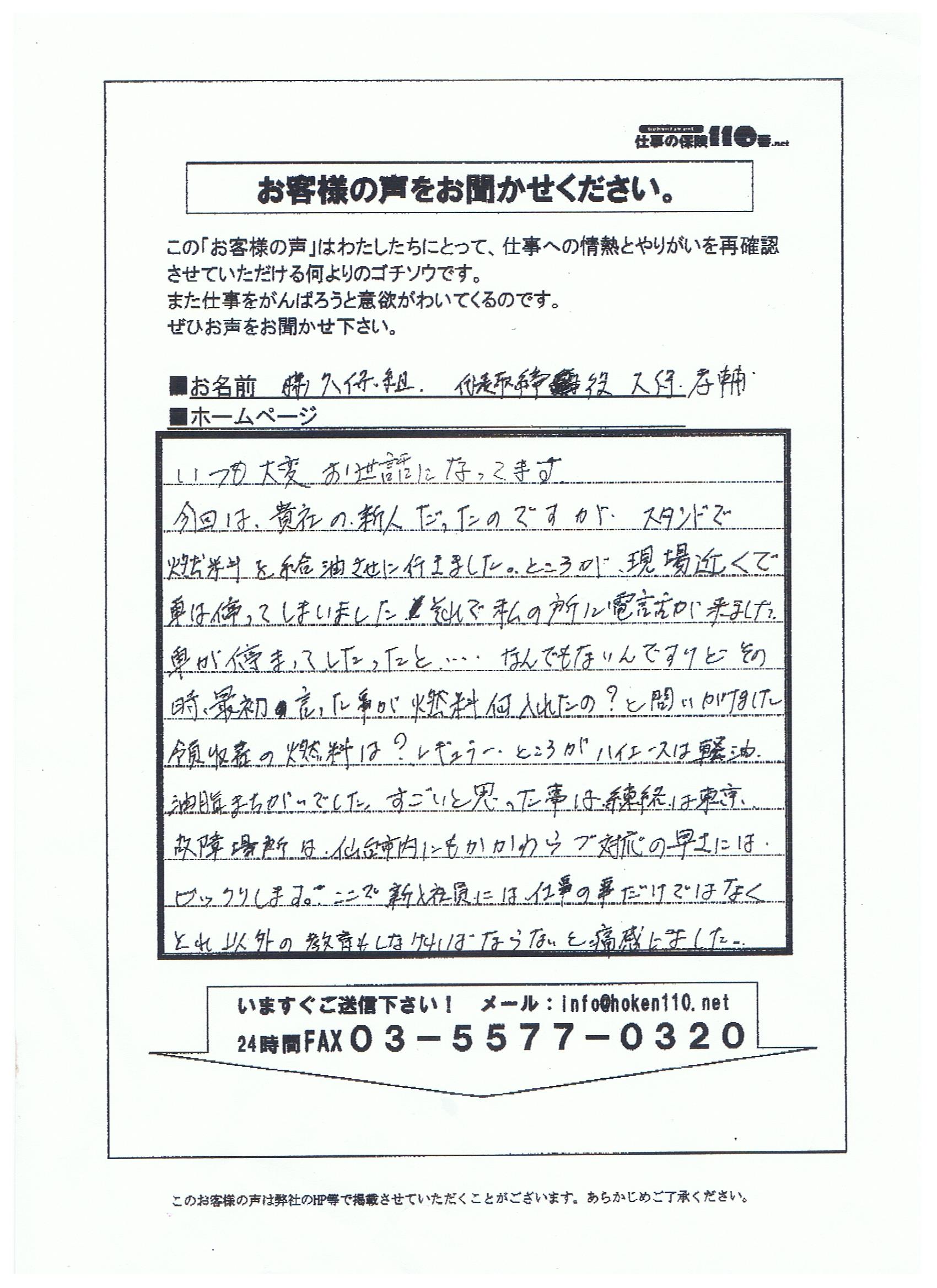 今回は貴社の新人だったのですが、スタンドで燃料を給油させに行きました。