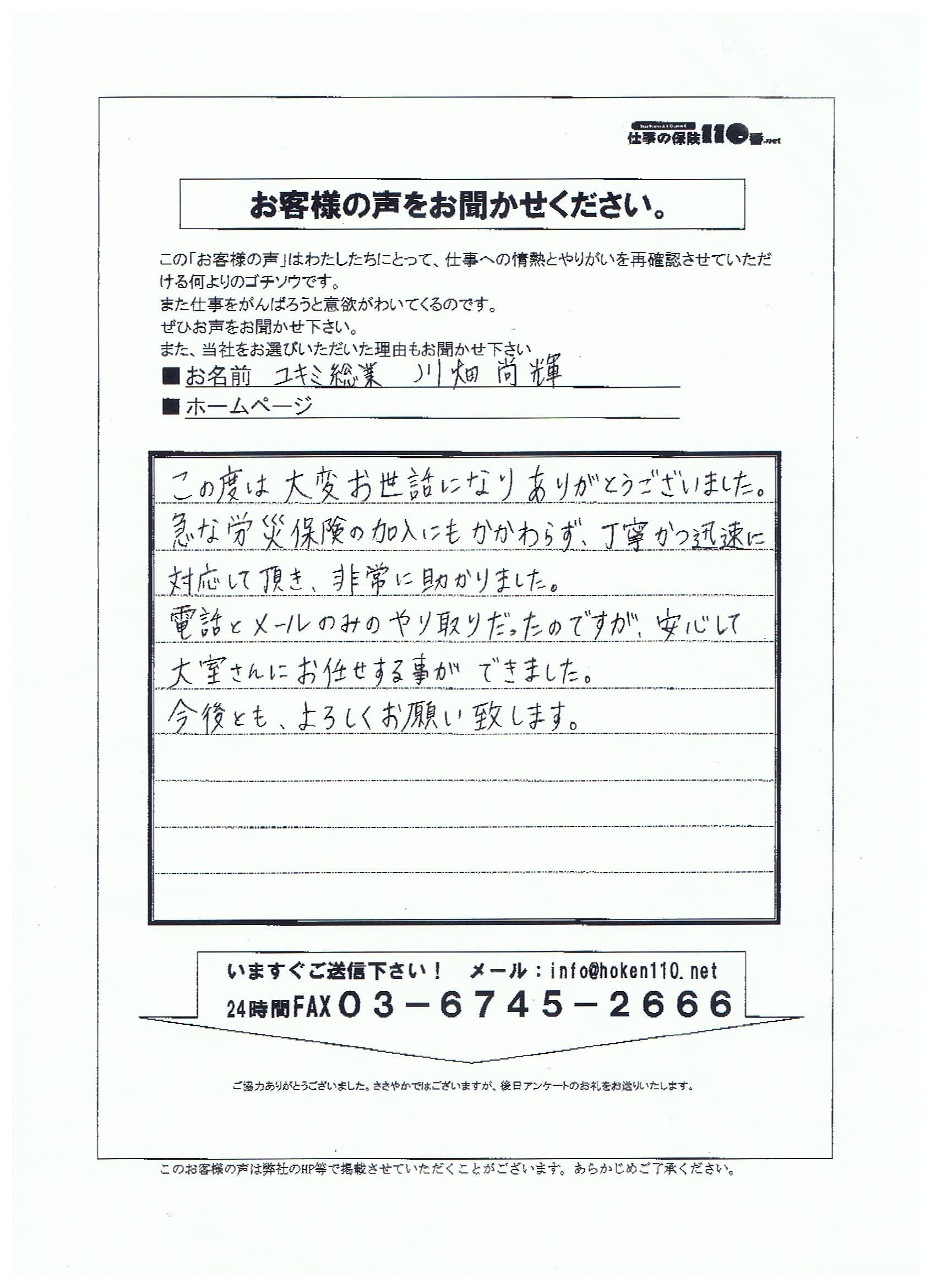 急な労災保険の加入にもかかわらず、丁寧かつ迅速に